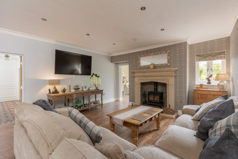 The house is set back from the village road behind a landscaped garden with a traditional covered well and a pretty village beck which wends its way around to the south of the property. Every room is beautifully appointed.  The large kitchen dining room has a westerly outlook across the gardens and grounds and is open plan to the family room, both with underfloor heating beneath a ceramic tiled floor. There is a large island unit with a breakfast bar, granite worktops, Butler sink, induction hob, integrated Neff appliances including a microwave oven and ample space for a family-sized dining table.  Alongside is the utility room/boot room and separate cloakroom wc. There is a study with bespoke, fitted office furniture and two workstations. Two formal reception rooms flank the staircase at the front of the house and have wood-burning stoves housed in handsome fireplaces. A glorious addition is the garden room which has full-height, full-width bifold doors on the south and west elevations giving panoramic, far-reaching views across the lakeside gardens.  Upstairs, the principal bedroom suite with its bespoke fitted dressing room and bathroom, has bifold doors and a ‘breakfast’ balcony across its western face. There are three further double rooms and a single room all served by a superb house bathroom.